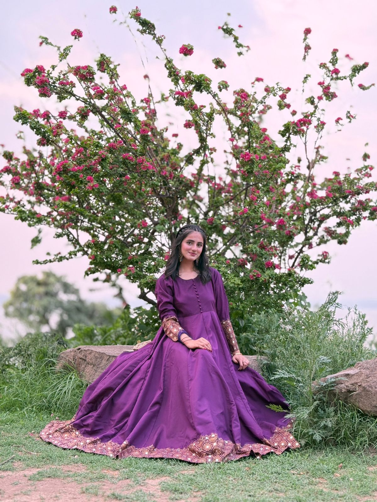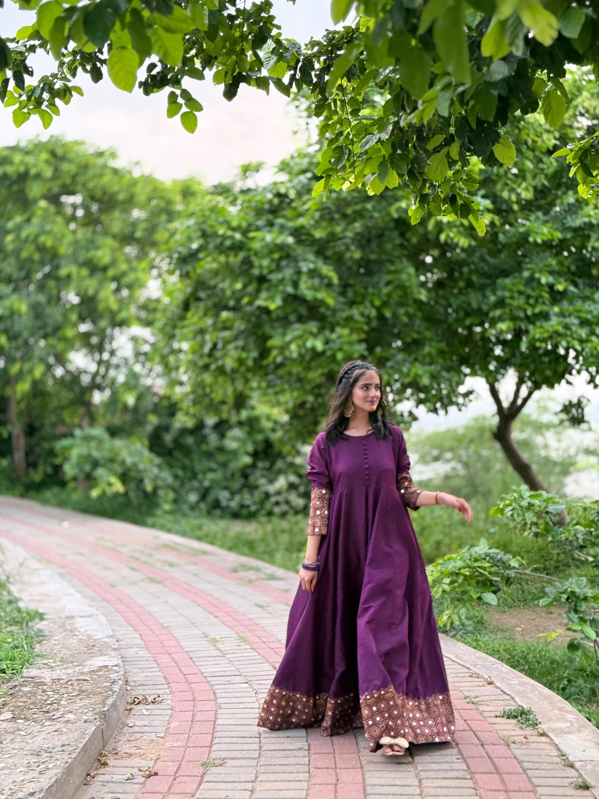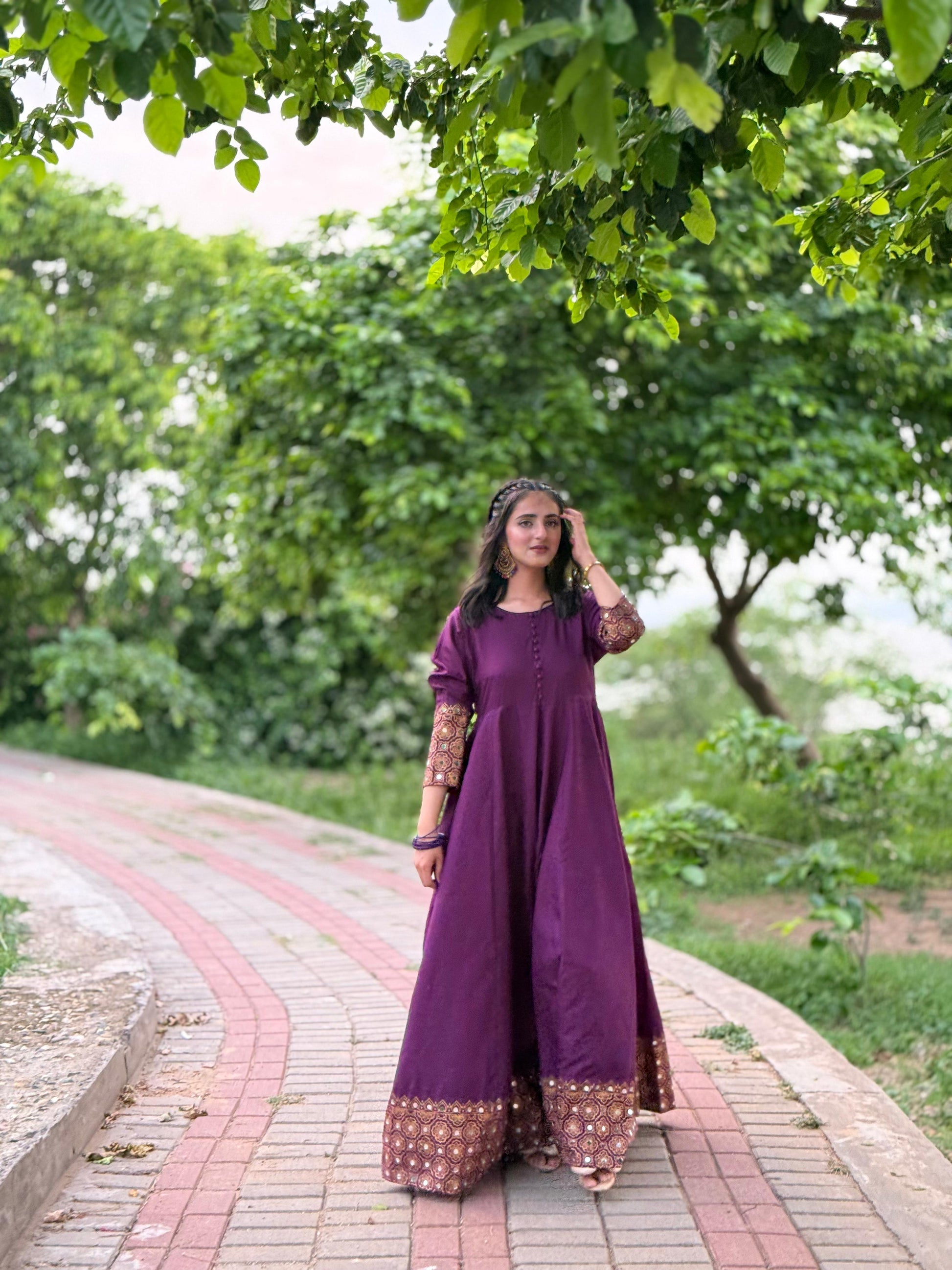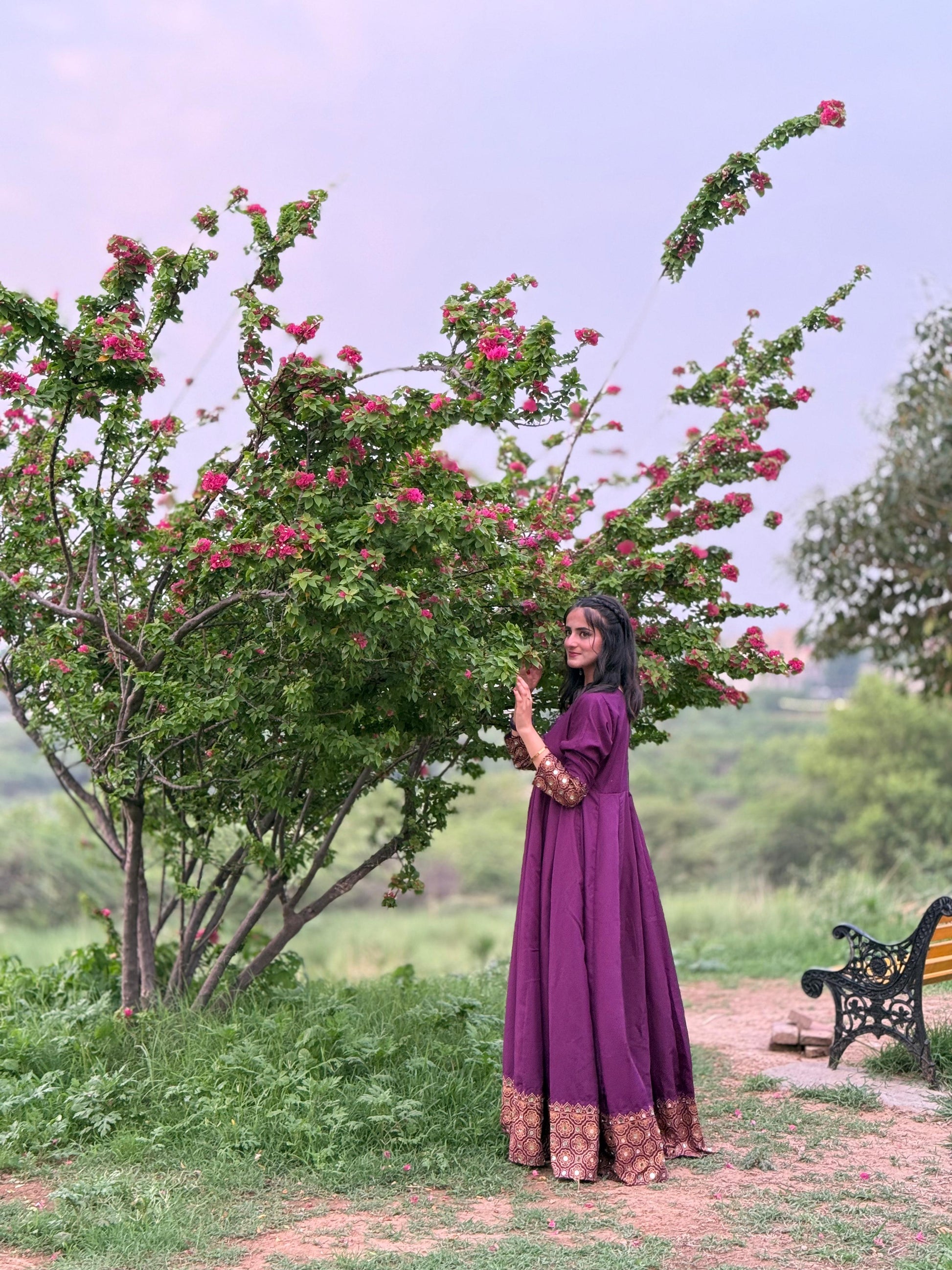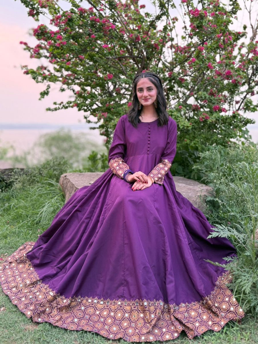 IT'S A 2PC MAXI IN PURPLE COLOR HAVING SCREEN PRINTED AND MIRROR WORK ON IT FABRIC IS AVAILABLE IN BOTH SEASONS