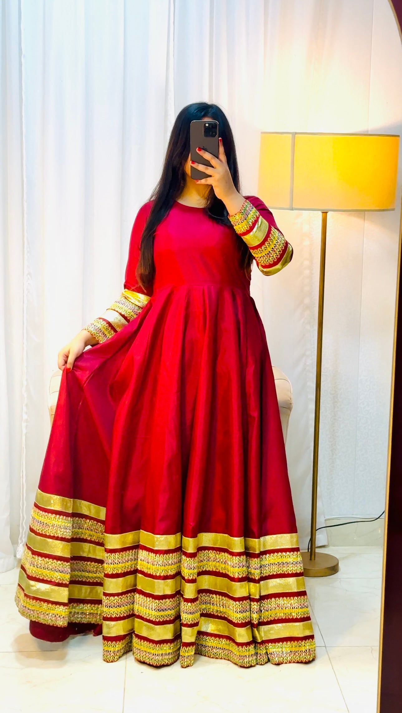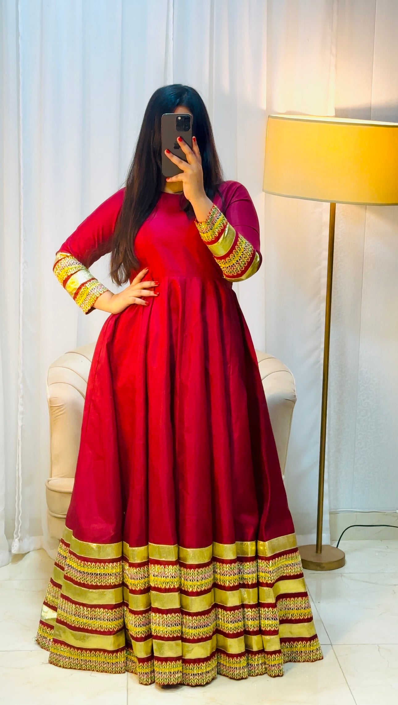 its 2pc maxi with capri...fabric is for both seasons ,in winter its fabric is silk in summer its fabric cotton... on maxi there is work of multi laces with combination of golden laces..its flayer is 180+ inches... sizes can be customize on demand...
