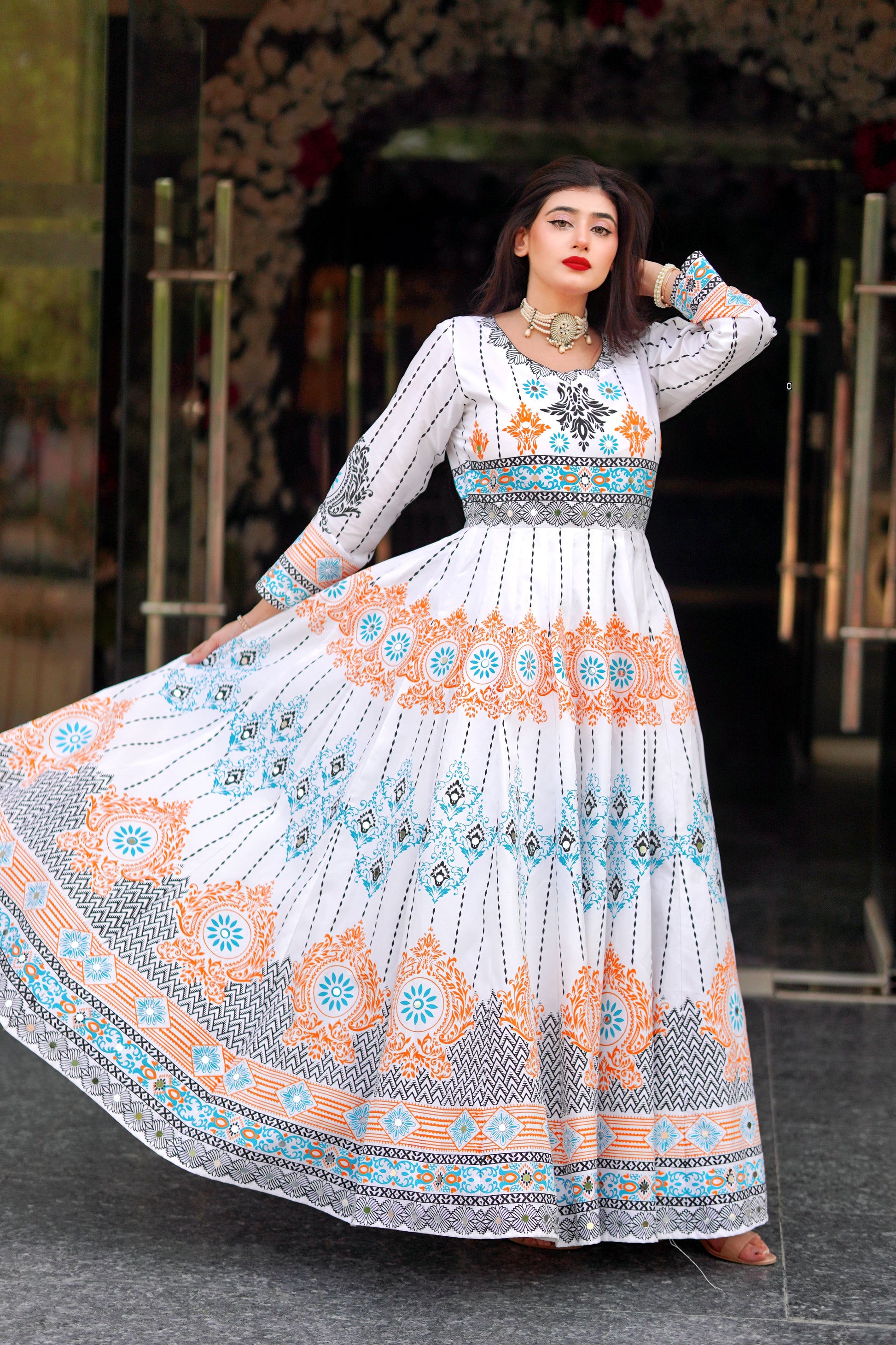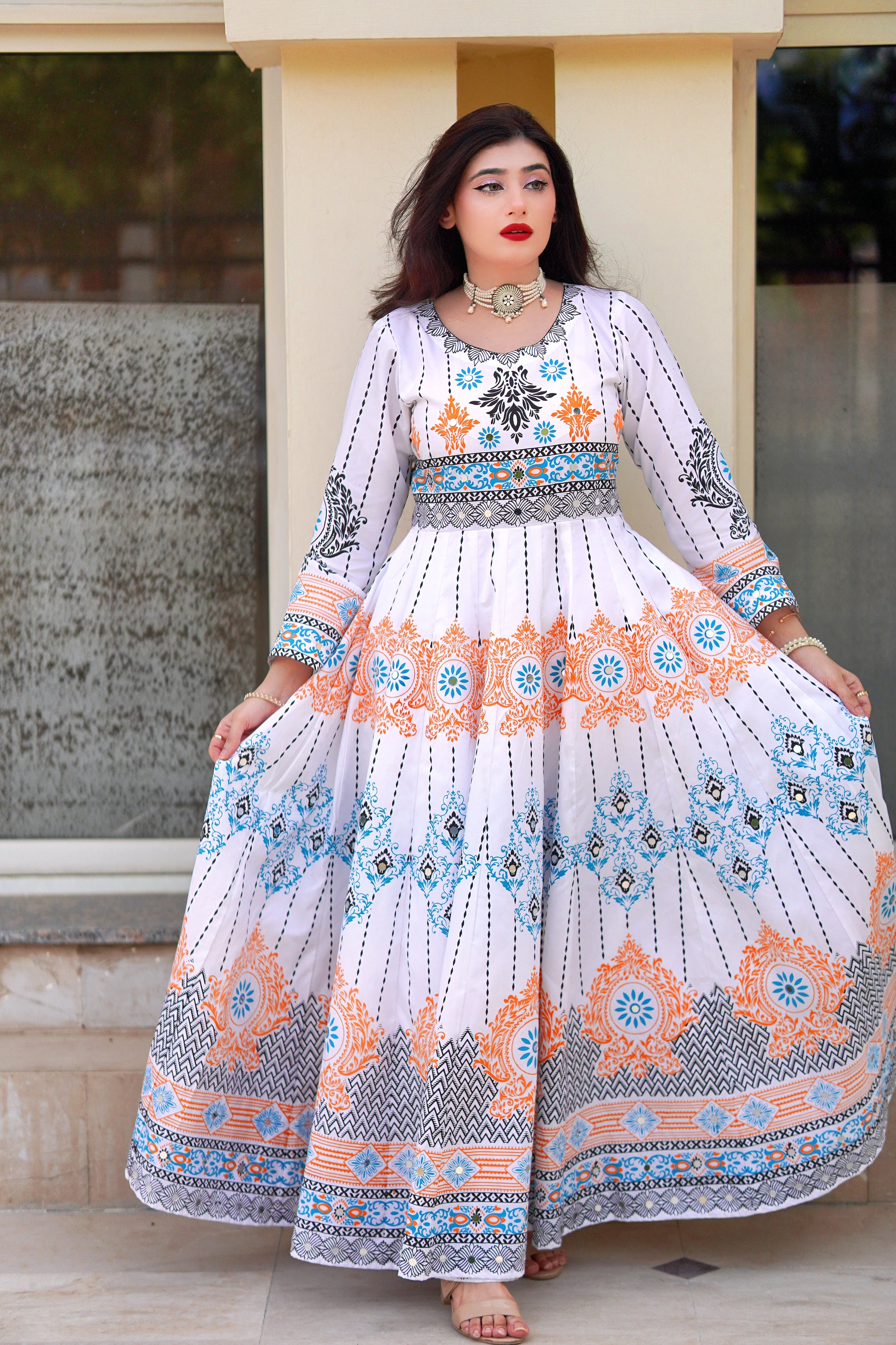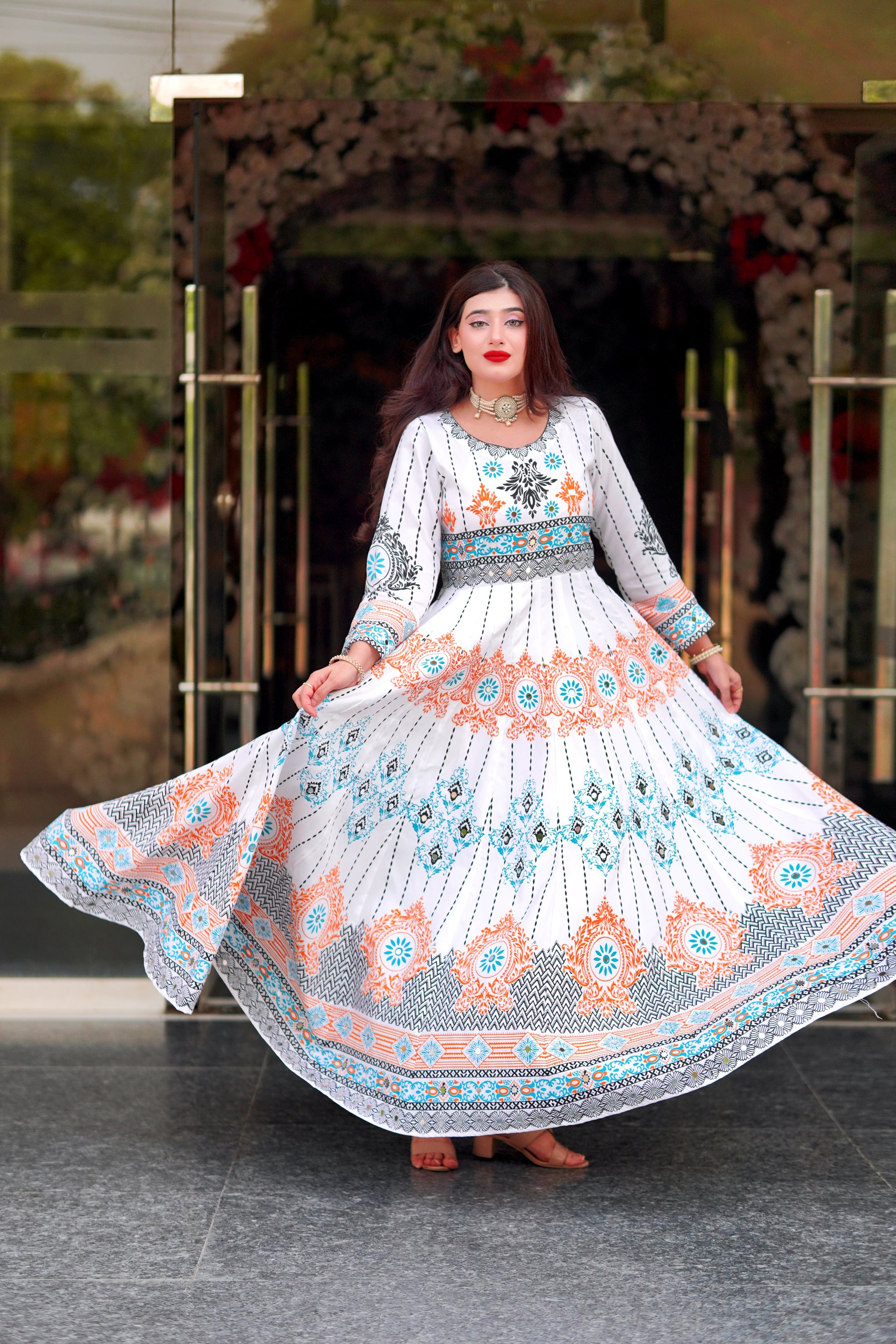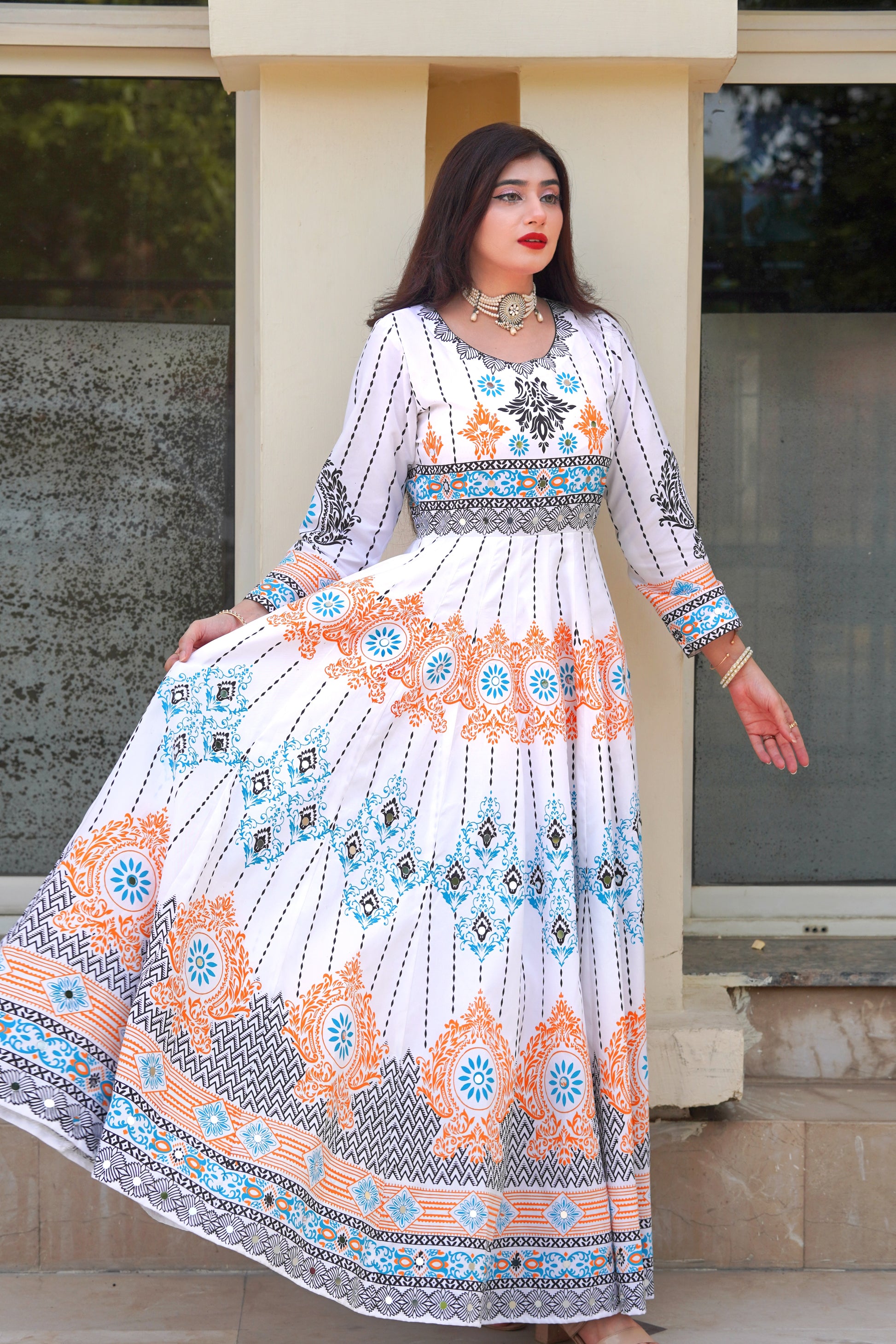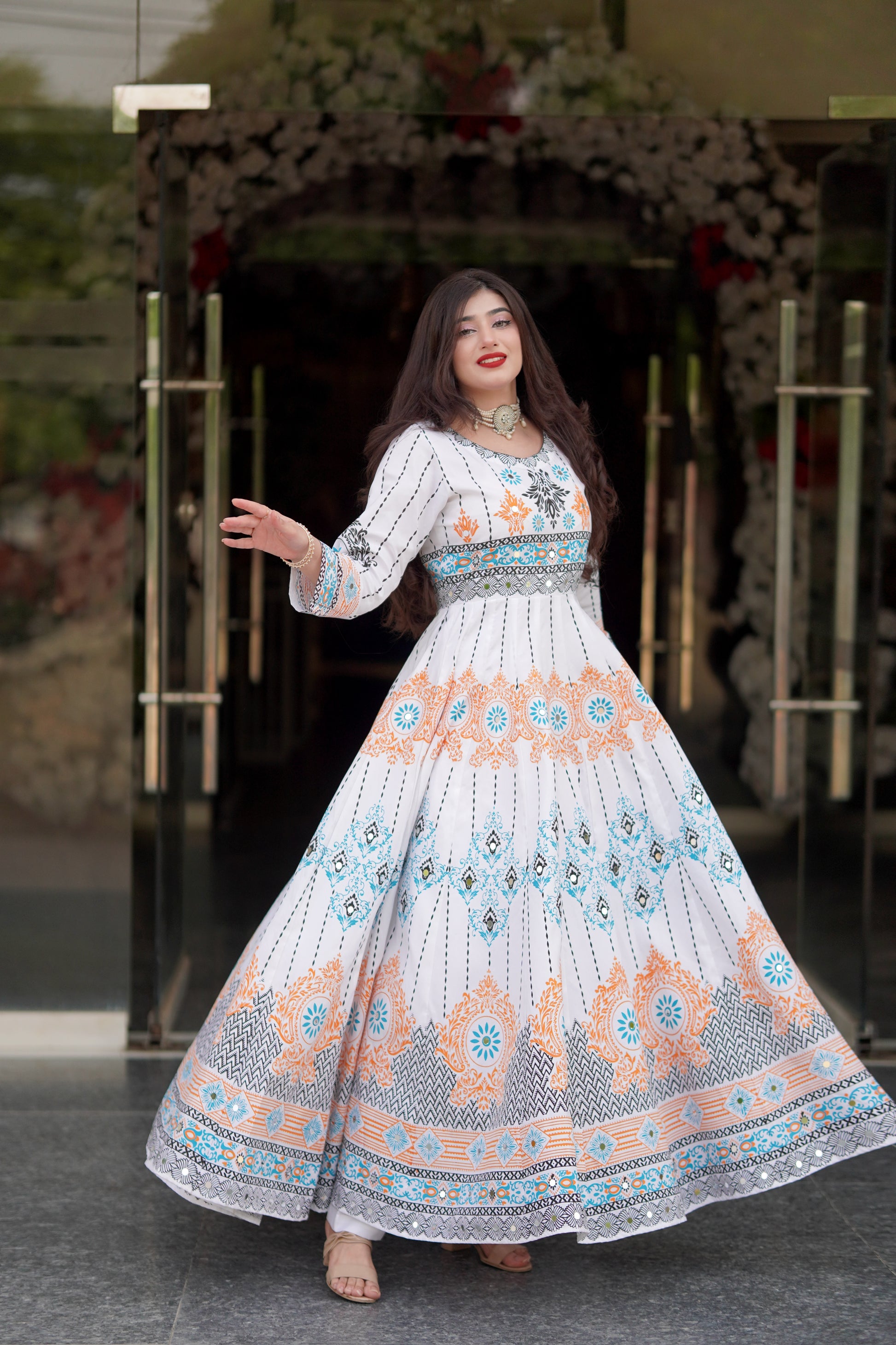 ITS 2PC MAXI WITH CAPRI, ON WHOLE MAXI THERE IS SCREEN PRINT WITH MIRROR WORK INCLUDES ON IT.....FABRIC IS AVAILABLE FOR BOTH SEASONS WINTER AND SUMMER....