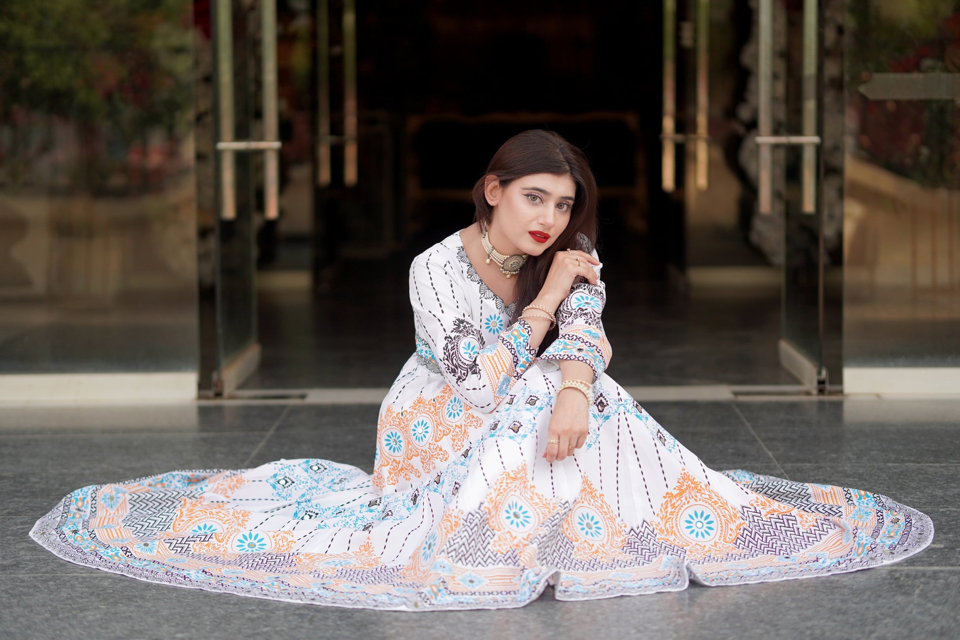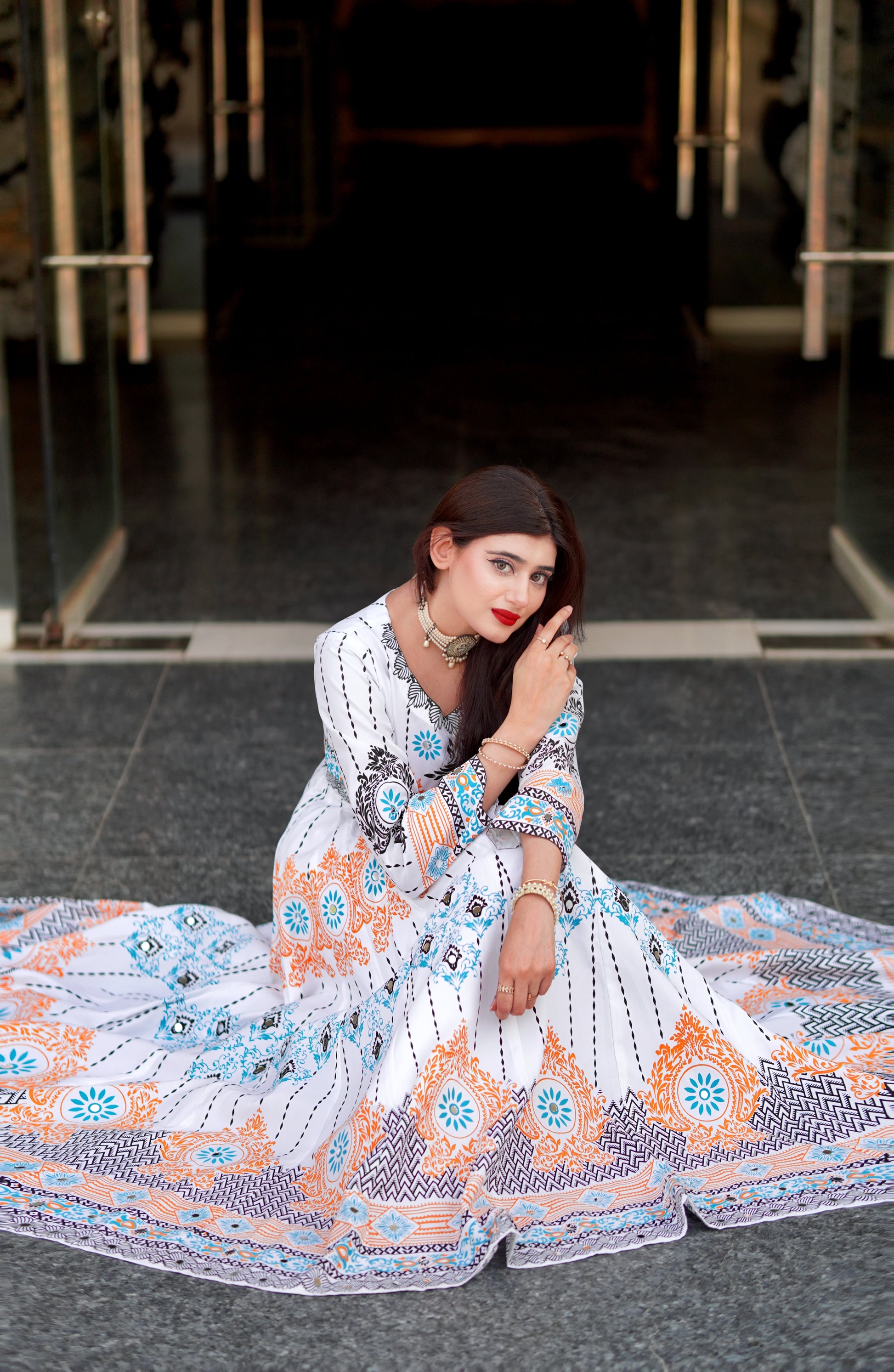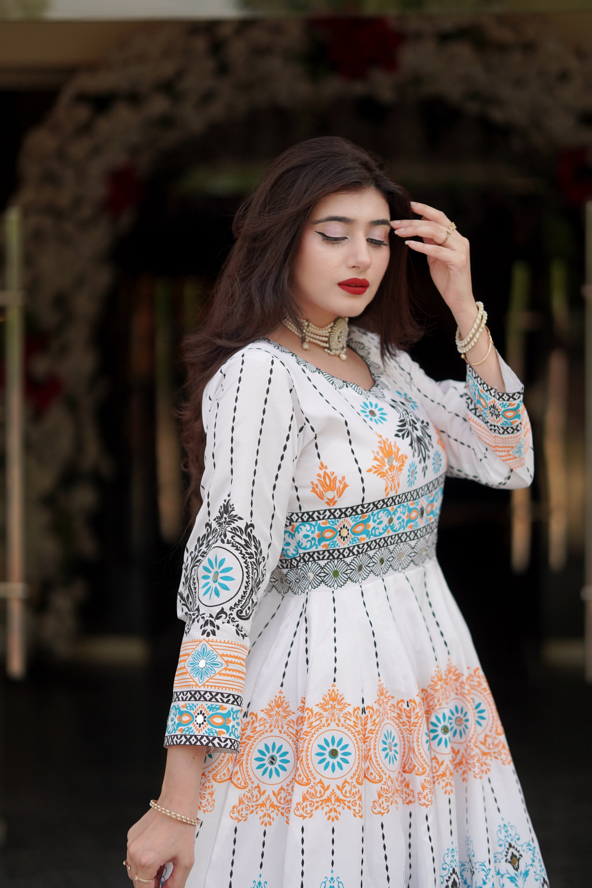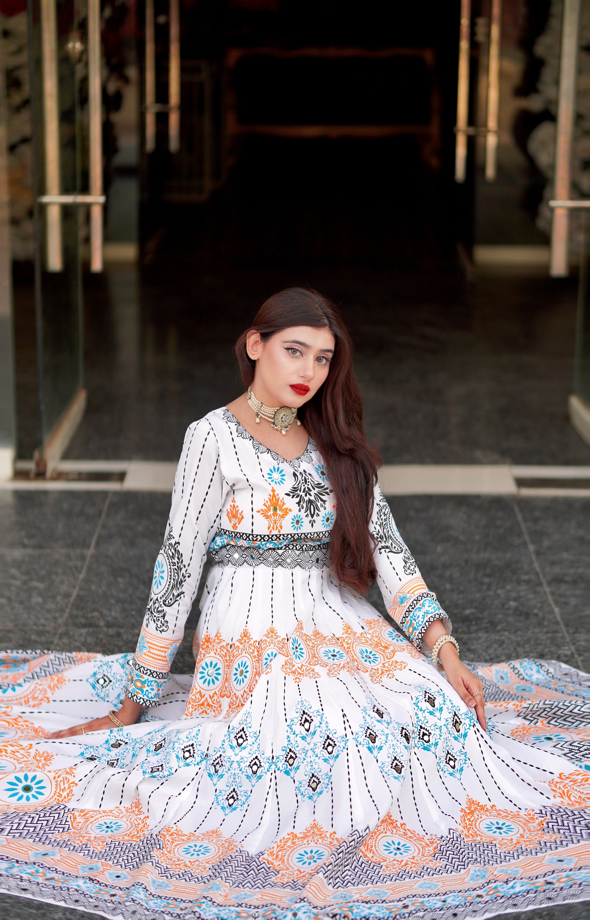 ITS 2PC MAXI WITH CAPRI, ON WHOLE MAXI THERE IS SCREEN PRINT WITH MIRROR WORK INCLUDES ON IT.....FABRIC IS AVAILABLE FOR BOTH SEASONS WINTER AND SUMMER....