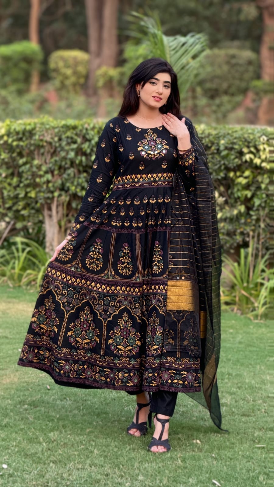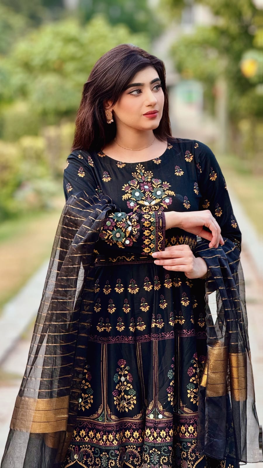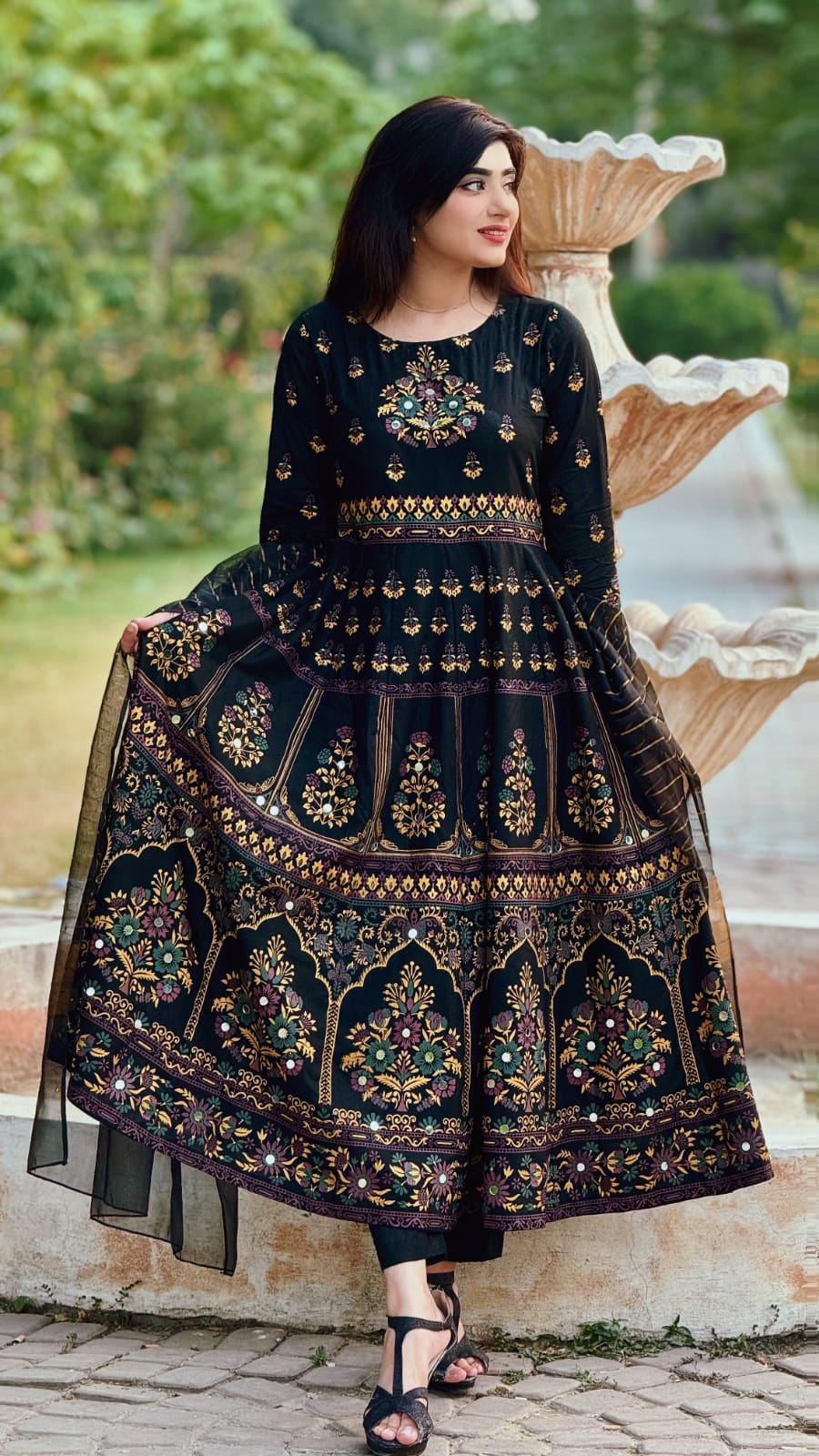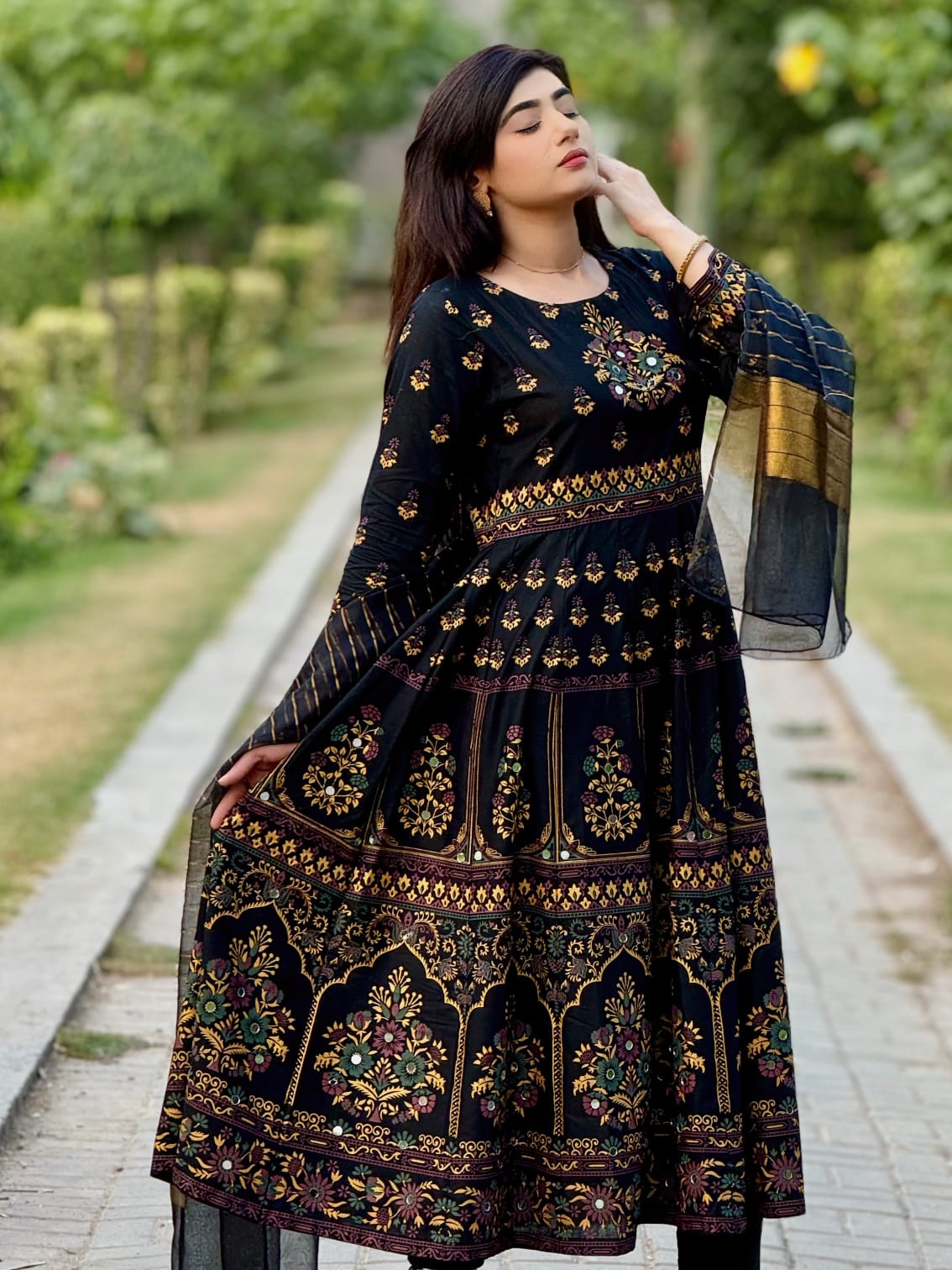 Its 3pc dress, available in cotton satin,on whole maxi there is block print mirror work makes it more beautiful, duppta fabric is organza.