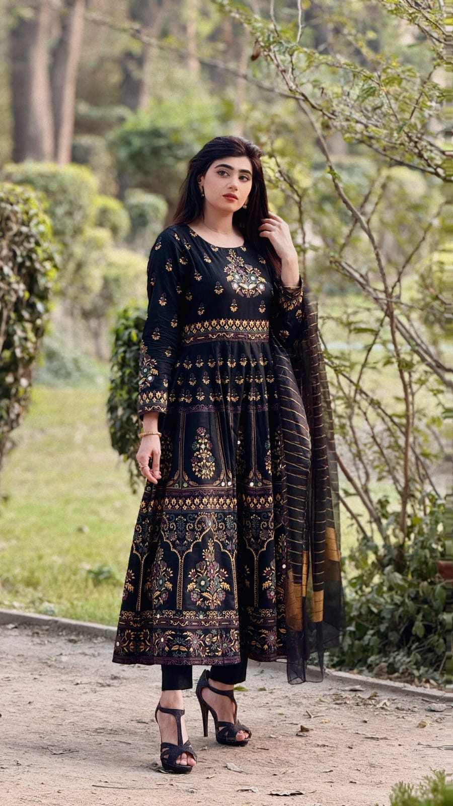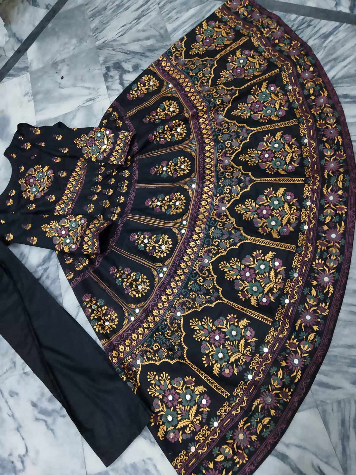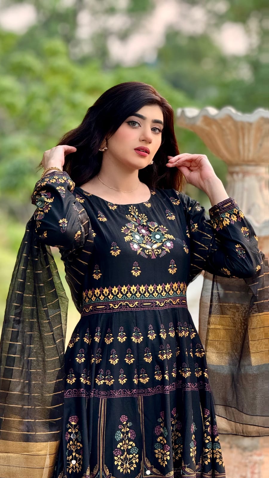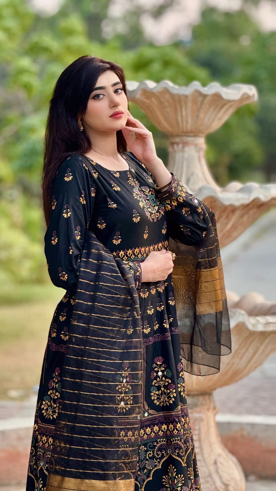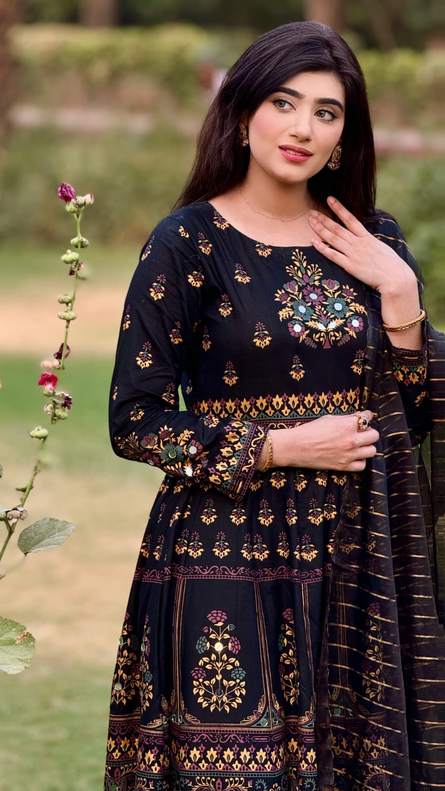 Its 3pc dress, available in cotton satin,on whole maxi there is block print mirror work makes it more beautiful, duppta fabric is organza.