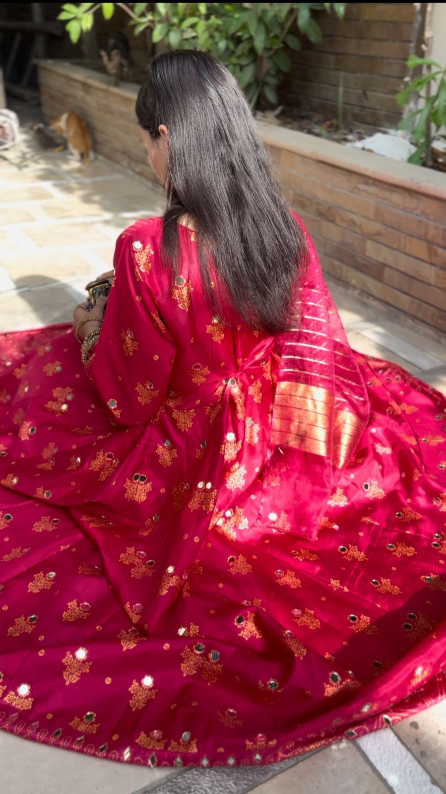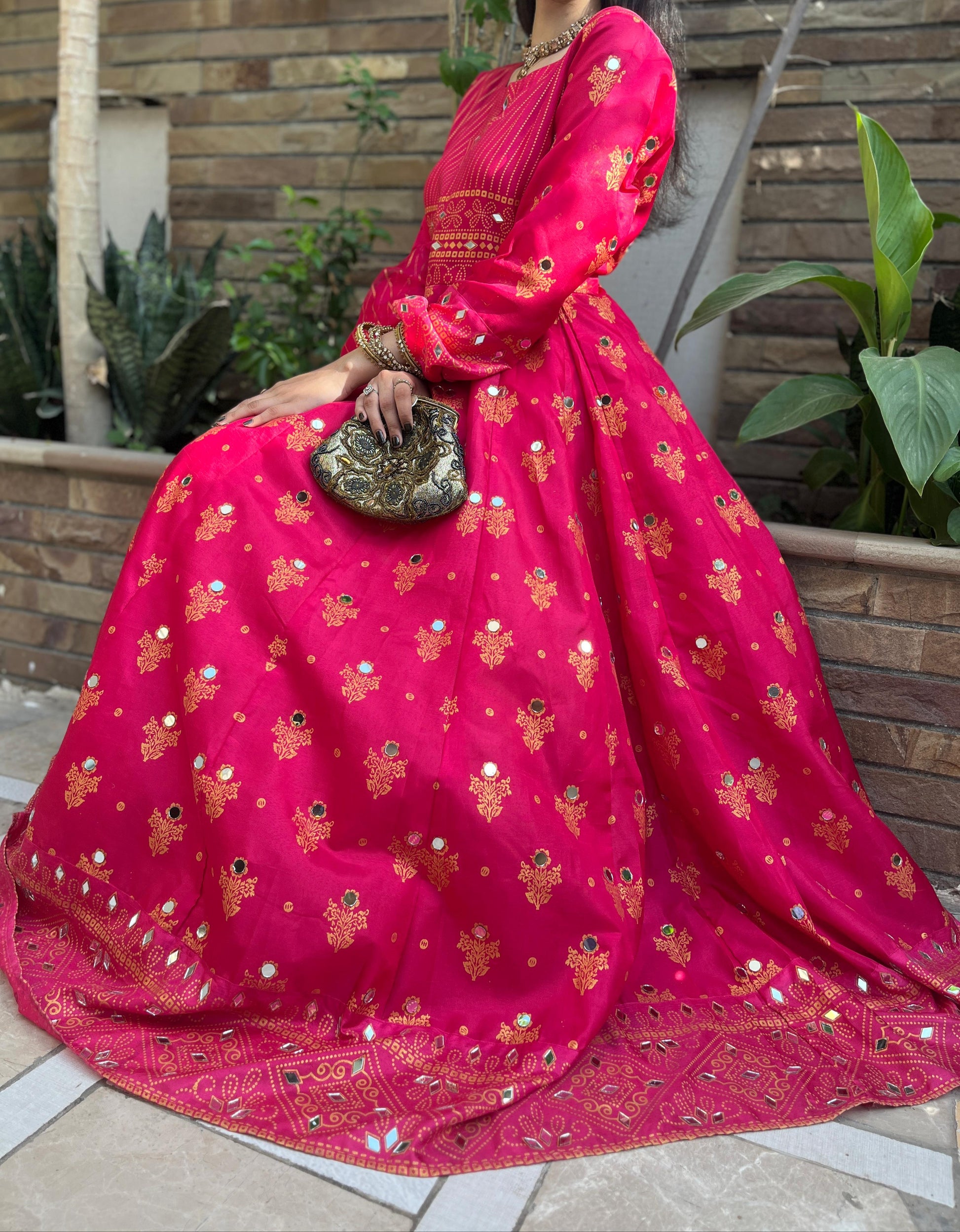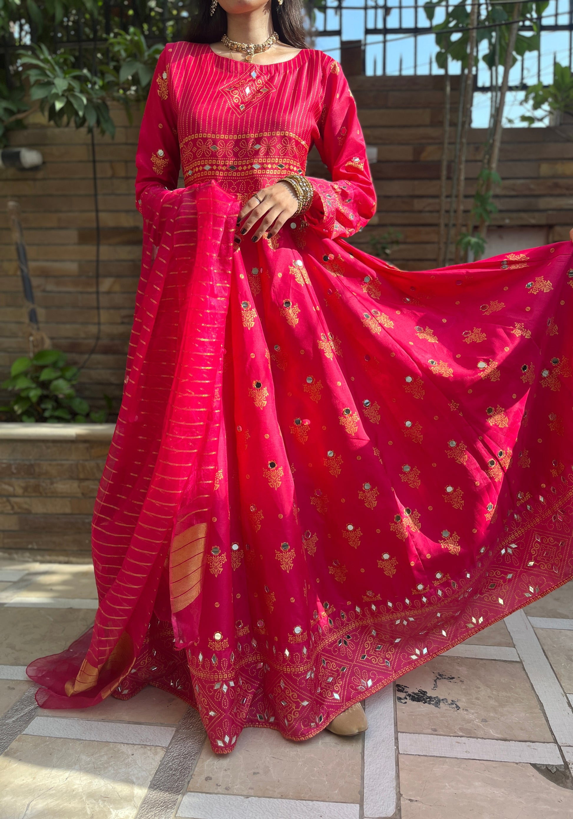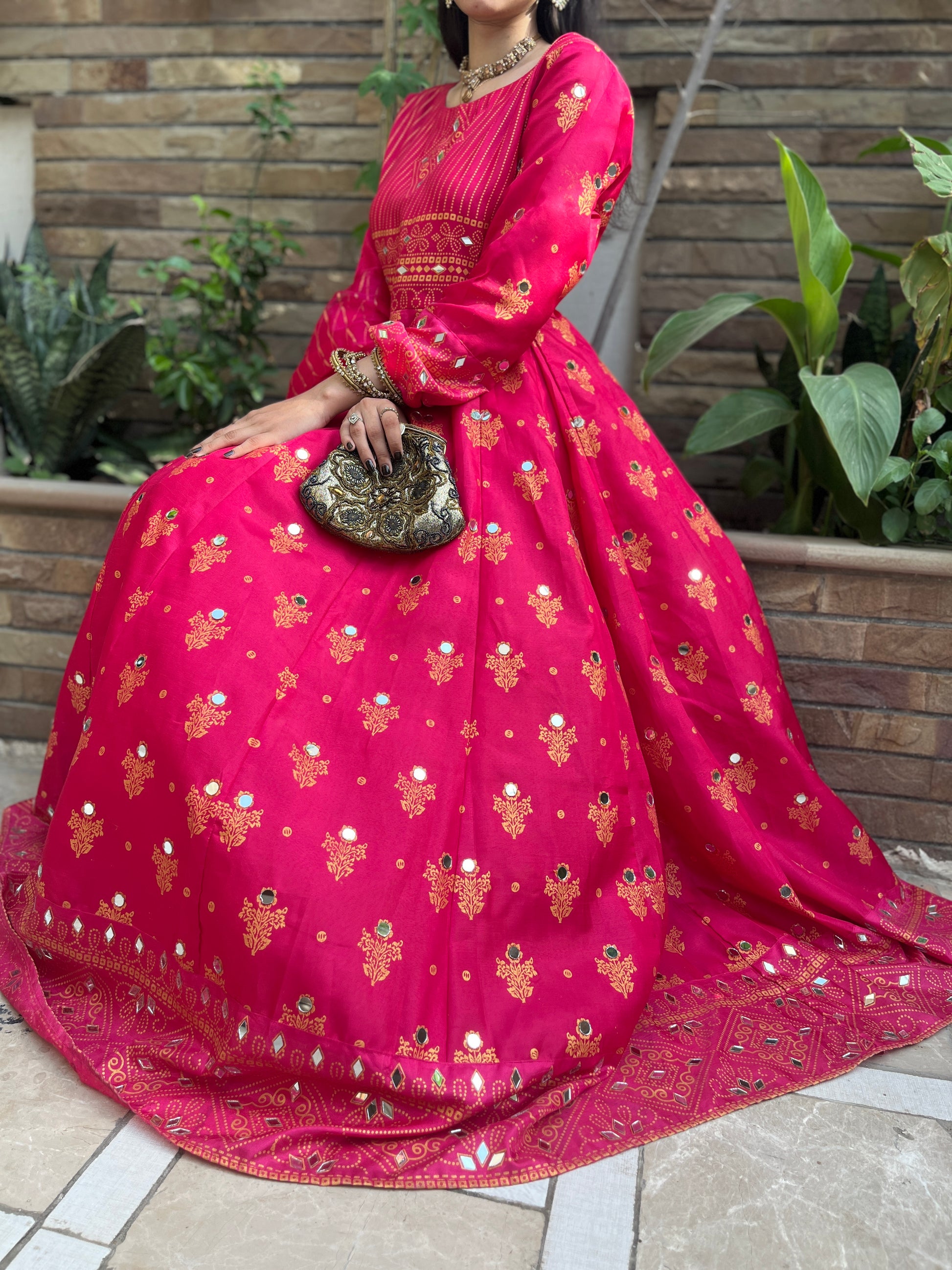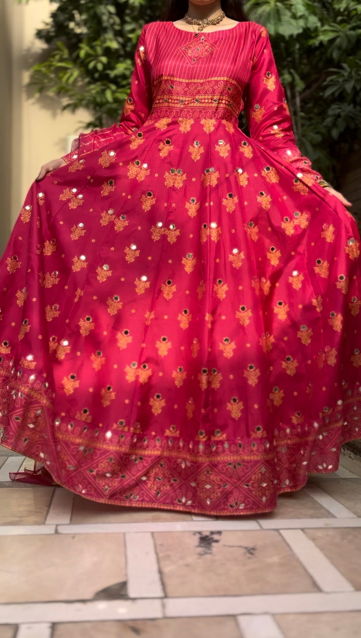 IT'S A 3PC MORNI MAXI IN PINK COLOR HAVING SCREEN PRINTED AND MIRROR WORK ON IT . FABRIC IS AVAILABLE FOR ALL SAEASONS .